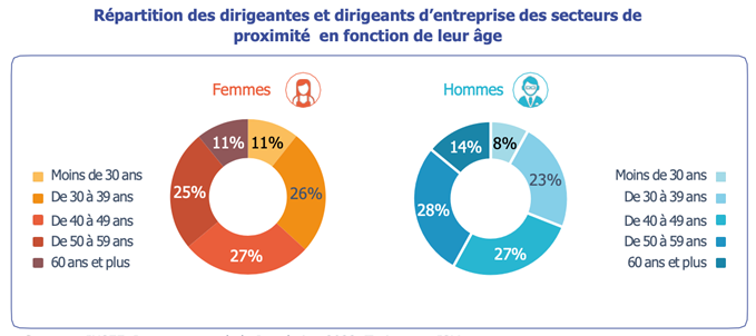 L’accès à la direction d’entreprise intervient fréquemment après une première expérience salariée ou à la suite d’une reconversion professionnelle. Les cheffes d’entreprise sont plus jeunes : 37 % ont moins de 40 ans contre 31 % des hommes. La tranche d’âge la plus représentée chez les femmes est celle des 40–49 ans.
