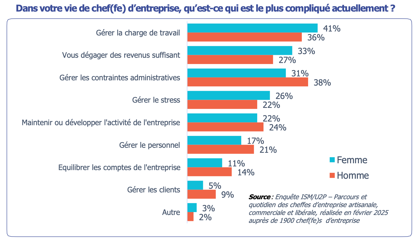 Dans ce contexte, la gestion de la charge de travail constitue le premier enjeu du quotidien pour les cheffes d’entreprise (41 % contre 36 % des hommes), devant la question des revenus (33 %, contre 27 %). La nécessité de concilier vie professionnelle et vie personnelle est au cœur de leur organisation quotidienne.