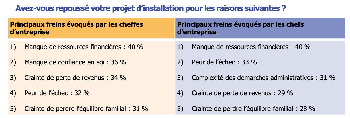 Les motivations entrepreneuriales des femmes rejoignent celles des hommes : le désir d’indépendance et de liberté dans le travail, cité par 71 % des créatrices et créateurs. La passion pour le métier arrive également parmi les moteurs principaux (43 %). Le besoin d’accomplissement et de sens pèse davantage (31 %) chez les femmes. L’enquête confirme aussi des obstacles récurrents à l’entrepreneuriat féminin. Les projets d’installation sont principalement freinés par le manque de moyens financiers (40 %), le manque de confiance (36 %) et la crainte d’une perte de revenus (34 %).