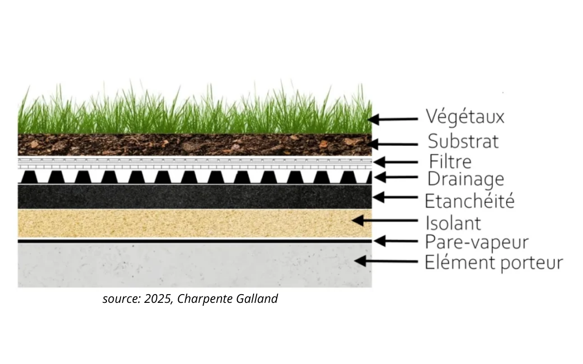 Une toiture végétalisée se compose de plusieurs couches comme présenté ci-dessous. Cette superposition permet d’isoler le bâtiment, de retenir l’eau de pluie et de créer un espace propice au développement de la végétation.