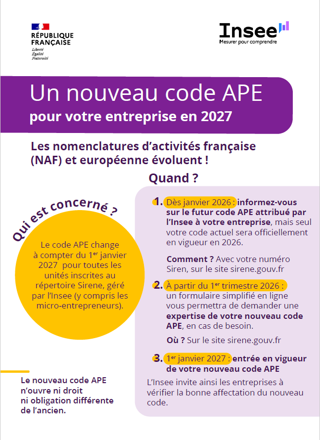 Cependant, ce n’est qu’à compter du 1er janvier 2027 que le nouveau code APE entrera en vigueur.